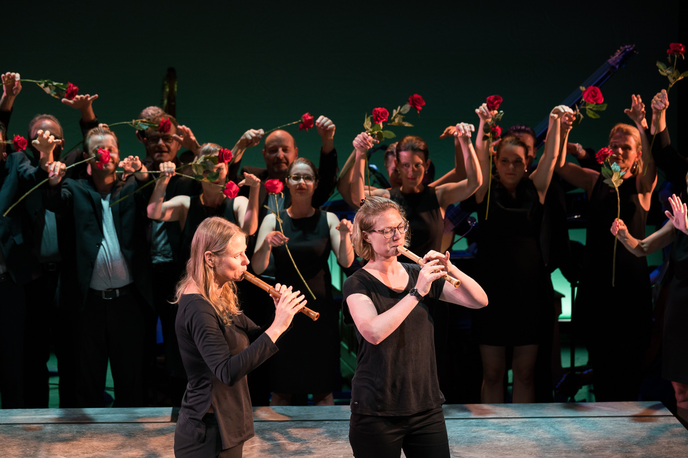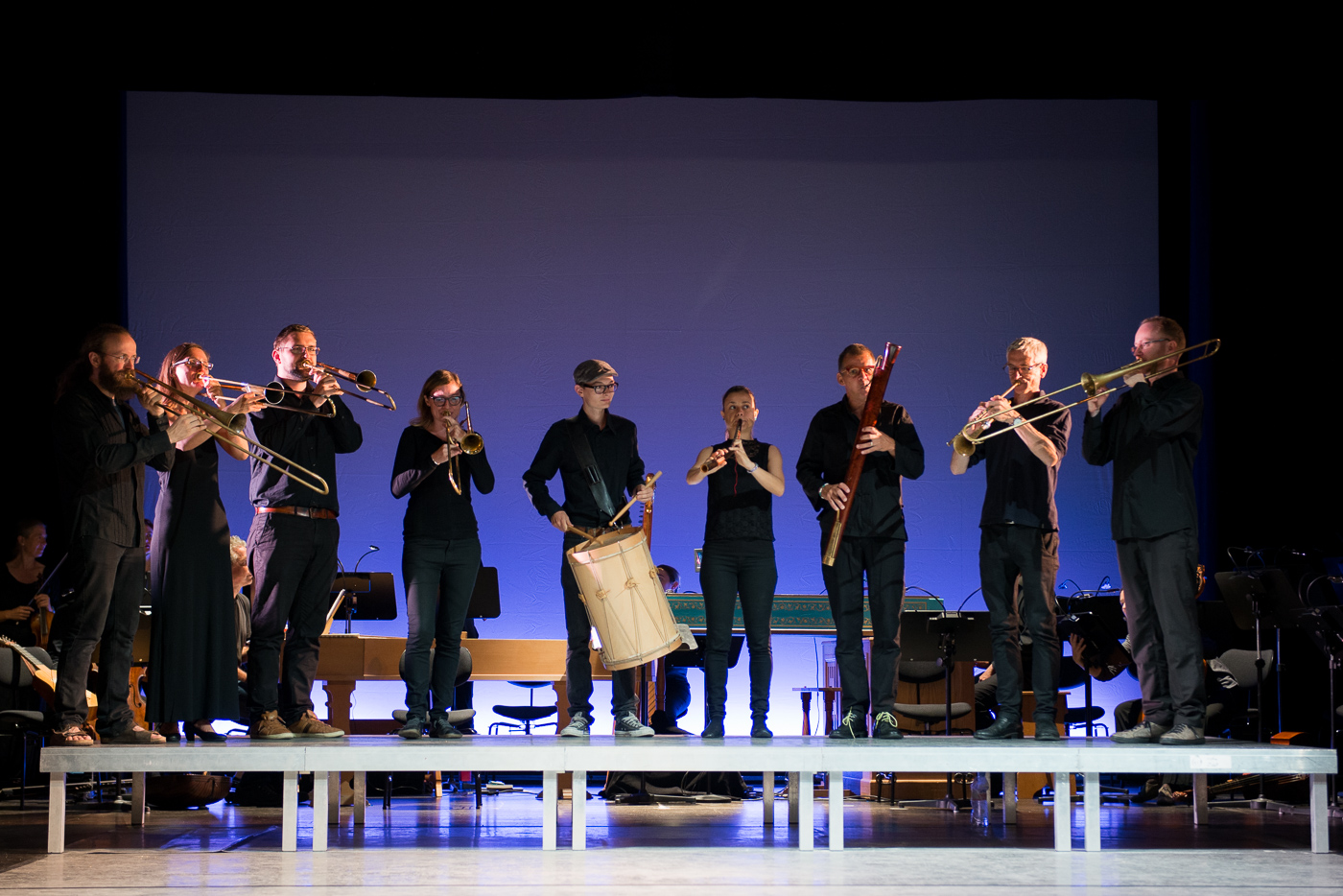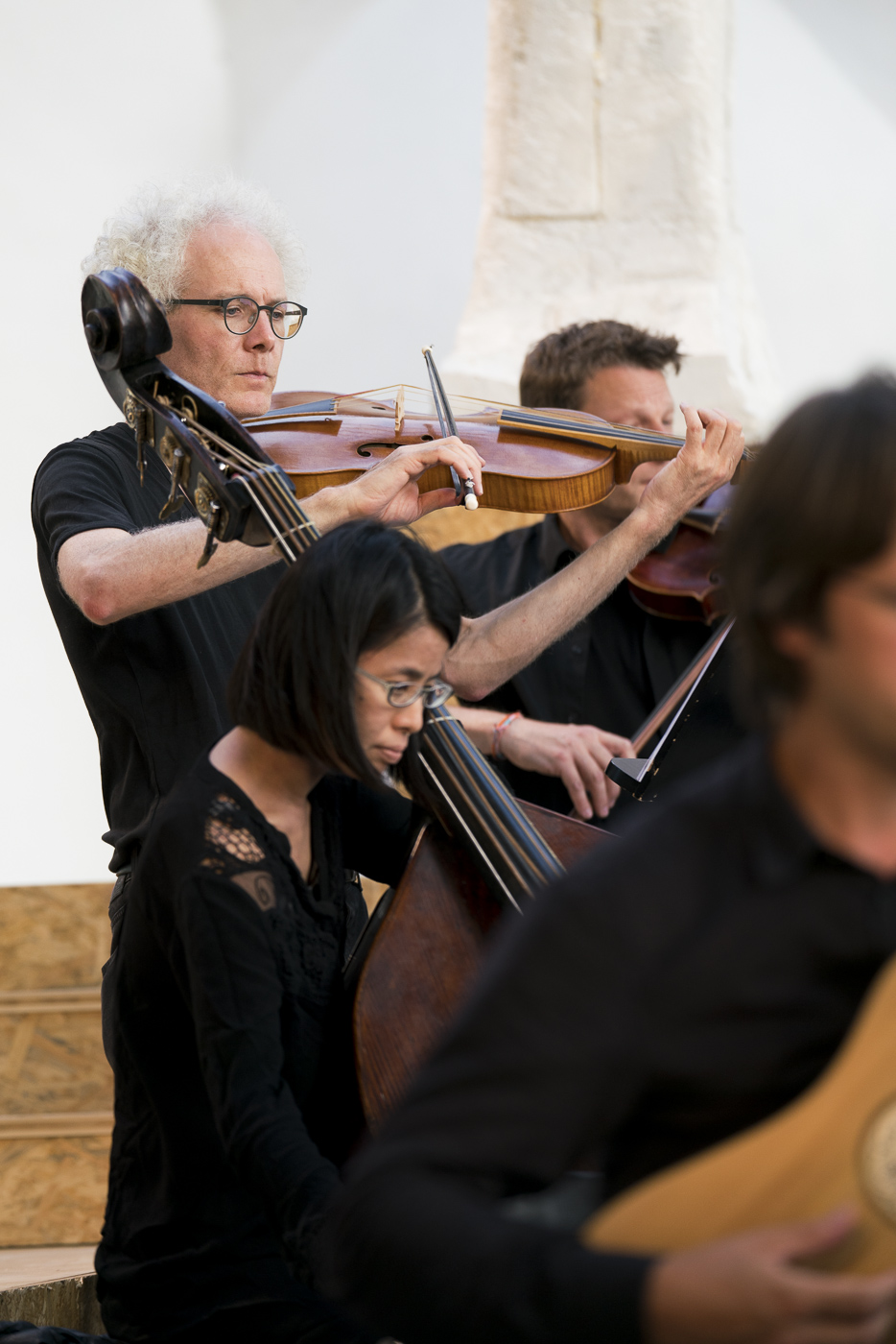 Für l‘Orfeo verwandelte sich das cantus firmus consort in ein Renaissance-Orchester: ein farbiges Continuo mit zwei Cembali, Regal, Orgel und zwei Lauten bildeten das Fundament. Dazu gesellen sich Zinken, Blockföten, Violinen, Violen, Gambe, Lirone, Cello und Violone. Die Stimmung der Unterwelt wurde von fünf Posaunen wiedergegeben.